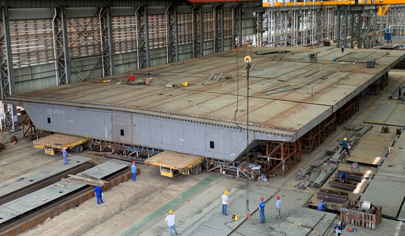 上午11時(shí),隨著現(xiàn)場(chǎng)總指揮一聲令下,重達(dá)240余噸的首個(gè)鋼箱梁節(jié)段由兩臺(tái)150噸自行式液壓平板車(chē)緩緩抬起,平穩(wěn)脫離總拼胎架并駛出廠房,標(biāo)志著首輪6個(gè)節(jié)段拼裝完成并正式下胎,轉(zhuǎn)入室外臨時(shí)存放區(qū)。