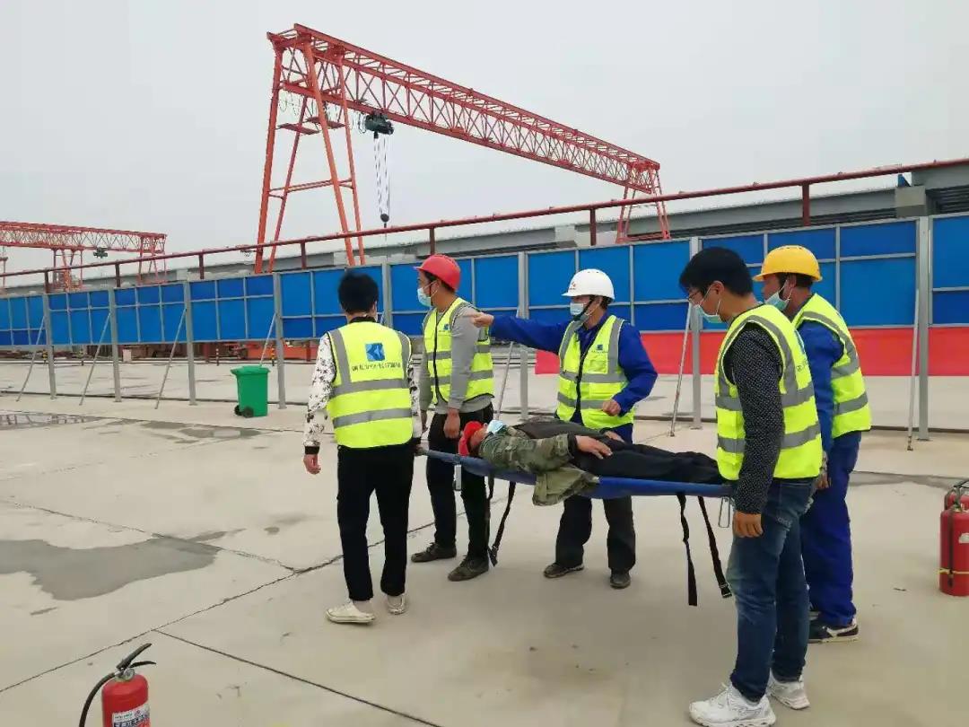 據(jù)本次消防演習(xí)負(fù)責(zé)人陳孝海透露,本次消防演練模擬疊拼場現(xiàn)場某作業(yè)人員在試用氣割時火花飛到油漆桶里使油漆燃燒發(fā)生火災(zāi),火勢迅速蔓延,引燃其它違章堆放的易燃品,工字鋼隨意擺放使其堵塞消防通道,火場內(nèi)被困人員兩人。疊拼場啟動應(yīng)急預(yù)案組織滅火自救并報119,將火撲滅。